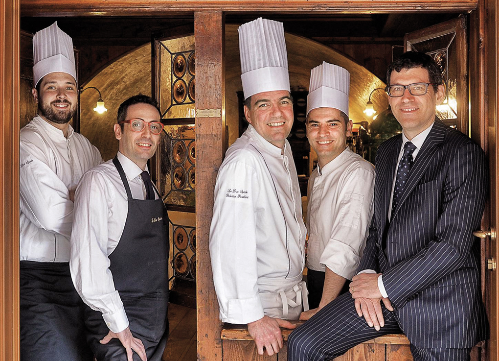 Cinquecento anni di ristorazione (le origini risalgono al 1545, anno del noto Concilio di Trento) a due passi dal Duomo: l’Osteria a le Due Spade accoglie sin da allora tutti gli amanti del buon cibo che passano da Trento. Ieri conciliari, pellegrini e viandanti, oggi tutti coloro che desiderano appagare il palato con piatti squisiti. Ci accoglie il patron Massimiliano Peterlana, e subito ci si immerge in un atmosfera magica, con la sala che racconta due epoche: una stube originale trentina del ‘700 in legno di cirmolo biondo all’inizio e una volta a botte del XVI secolo nel cuore del ristorante. A lato, un capolavoro di artigianato trentino: una “stufa a Olle” in maiolica verde, che regala un’atmosfera antica di grande suggestione. Nella bella stagione si può anche pranzare e cenare all’aperto, a due passi dalla porta del Duomo, apprezzando così anche la splendida architettura della città di Trento. In cucina lo staff guidato dal talentuoso Chef Federico Parolari, dà anima all’arte in tavola affiancato da Simone Bordignon e Dan Nezha, per offrire una grande cucina del territorio rivisitata in modo creativo, senza escludere alcune contaminazioni mediterranee. Sono rigorosamente le stagioni, non le tendenze, a regolare il variegato menù che cambia ogni quattro mesi. Lo chef Federico sceglie con cura i prodotti freschi di stagione, alcuni raccolti sul Monte Bondone, come le erbe spontanee ed i fiori in primavera ed estate, oppure il tartufo nero, il tutto impreziosendo le preparazioni con una cucina a km 0. La possibilità di scegliere tra due menù degustazione, uno con piatti prettamente del territorio, l’altro con eccellenze di mare, accompagnano i palati più esigenti che desiderano farsi coccolare dalle preparazioni dello chef. Chi invece desidera scegliere a la carte, può scegliere liberamente tra cinque antipasti, cinque primi, cinque secondi e sei dolci, tutti rigorosamente fatti in casa. Così come il pane ed i grissini, preparati ogni mattina da Paola, la moglie di Massimiliano, che sforna sin dalle prime ore del mattino una scelta di 10 tipi di pane diverso. A mezzogiorno il locale riesce anche a proporre un “Menù del Mezzodì” che si compone di due piatti, un calice di Trentodoc ed il caffè, ideale per un pranzo di lavoro senza rinunciare al gusto di una pausa veloce ma sfiziosa. Elencare tutte le prelibatezze del menù sarebbe impegnativo, ma alcune specialità della casa, vere e proprie “chicche” che l’affezionata clientela ama ritrovare da anni, sono spesso disponibili. Come il prelibato petto di fagiano lardellato, le mezzelune di patate con formaggio e tartufo nero, gli strangolapreti e i canederli preparati sia alla maniera tradizionale sia con nuovi abbinamenti (da provare quello alle ortiche) ed infine il filetto di cervo cotto in gemme d’abete. Per chiudere in bellezza il pasto assolutamente da provare è un dolce tipico della tradizione trentina, lo strudel di mele, ma presentato nella variante “scomposta”, oppure la sfogliatina calda di mele della Val di Non con confettura di albicocche fatta in casa dal sapore molto raffinato. E poi immancabili i formaggi, accompagnati da mostarde e mieli del Trentino, da provare in abbinamento ai vini che premiano la ricchezza enologica del territorio, non senza uno sguardo alle migliori etichette internazionali: più di 500 etichette rigorosamente selezionate da patron Massimiliano ed il sommelier Gianni Pasolini. Dagli internazionali Chardonnay, Pinot Nero, Cabernet, Merlot e Syrae, agli aromatici Traminer, ai semi aromatici Muller Thurgau, Riesling agli autoctoni Nosiola, Marzemino e Teroldego. E per concludere il pasto in bellezza, in abbinamento con i dolci o i formaggi, una ricca selezione di vini da “meditazione”.